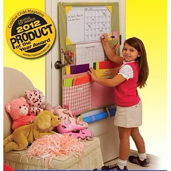 本品包含了一塊磁吸白板,旁邊小袋放置附送的白板筆和白板擦,板上面印了月曆和空格,讓你提前可以針對未來一個月做好計畫,並隨時提醒自己重要事情;正中央有一格大型透明窗讓你自己設計每天晚午餐菜單或學校行程做出規劃,兩側小格透明窗口可放筆、橡皮擦、膠水、尺、剪刀、隨身碟...透明看的見;底下四格文件夾尺寸大型口袋,各袋顏色不同,口袋前設計可抽取標貼,可分門別類放置作業本、書本、字典、文件、圖表...等,最底下有兩條魔術氈可掛美勞作品,另附兩個無痕掛勾讓你隨處可掛。